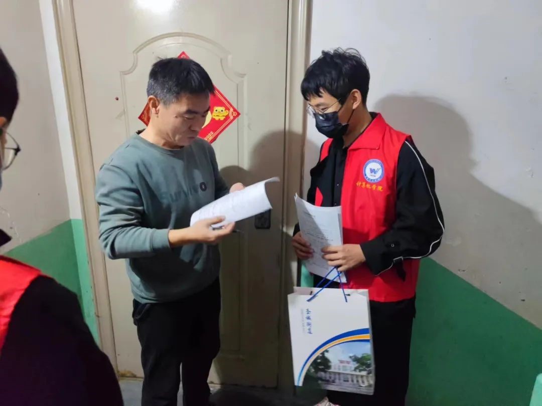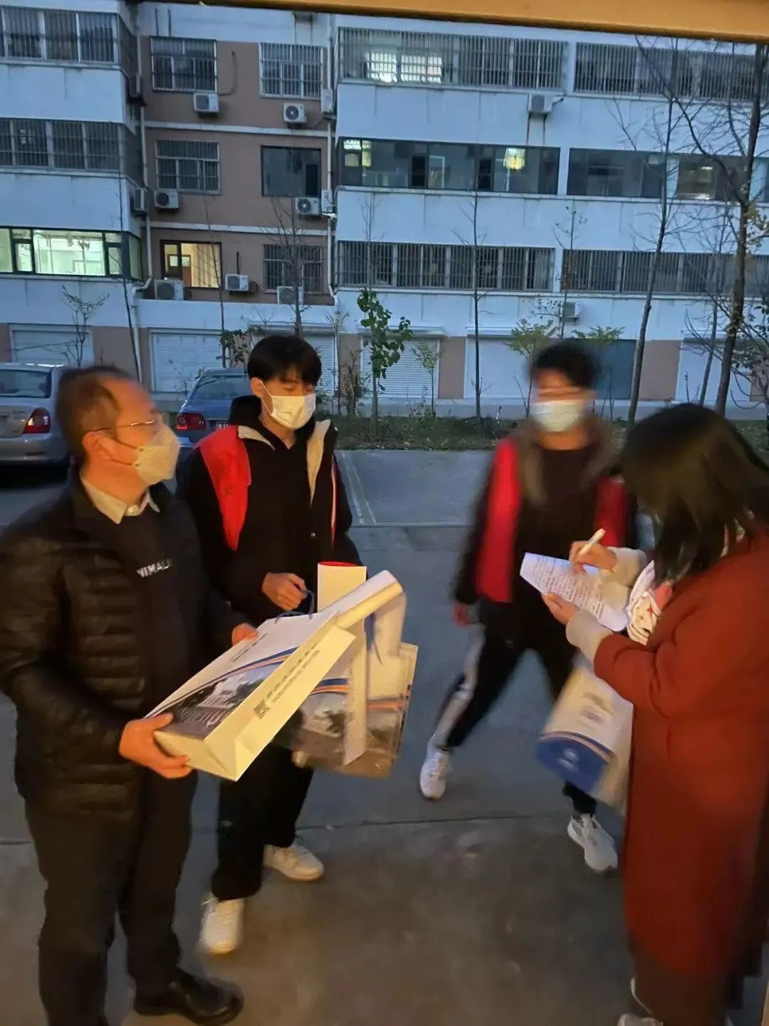 志愿者们在教师党员的指引下,将“二十大精神”带入教师公寓,带头亮身份、践承诺。在志愿服务过程中,志愿者们积极主动,通过挨家挨户拜访的方式,为学院社区住户宣传疫情防控知识,讲解了医疗保险和疫苗接种等国家防疫政策。宣传完政策后,志愿者们不忘提醒住户们禁售、禁燃、禁放烟花爆竹以及其他用电安全注意事项。