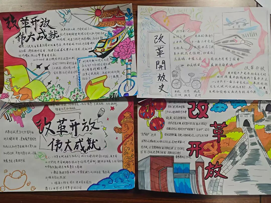 为拓宽学生历史视野,学院党委开展“改革开放”主题手抄报活动,为学子提供了创意表达的平台。同学们积极参与,将改革开放以来的科技腾飞与改革开放的意义结合,将文字与绘画相结合,精心勾勒改革画卷。在绘制手抄报内容的过程中,同学们系统了解了改革开放的历程——从破冰探索到全面深化,这不仅让同学们拓宽了历史视野,更明白了“改革开放是决定当代中国命运的关键一招”。