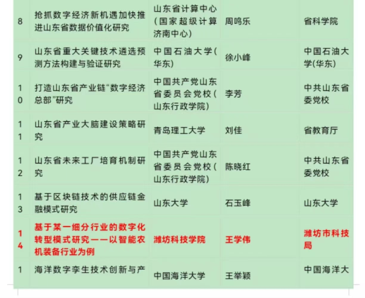 山东省重点研发计划(软科学)拟立项项目,在全省共立项重大项目24项、重点项目36项、青年项目28项。立项单位包括山东大学、中国海洋大学、山东省计算中心等省内知名高校和科研机构。王学伟教授团队获批立项的重点项目为我校唯一立项项目,在潍坊地区也是唯一立项项目。