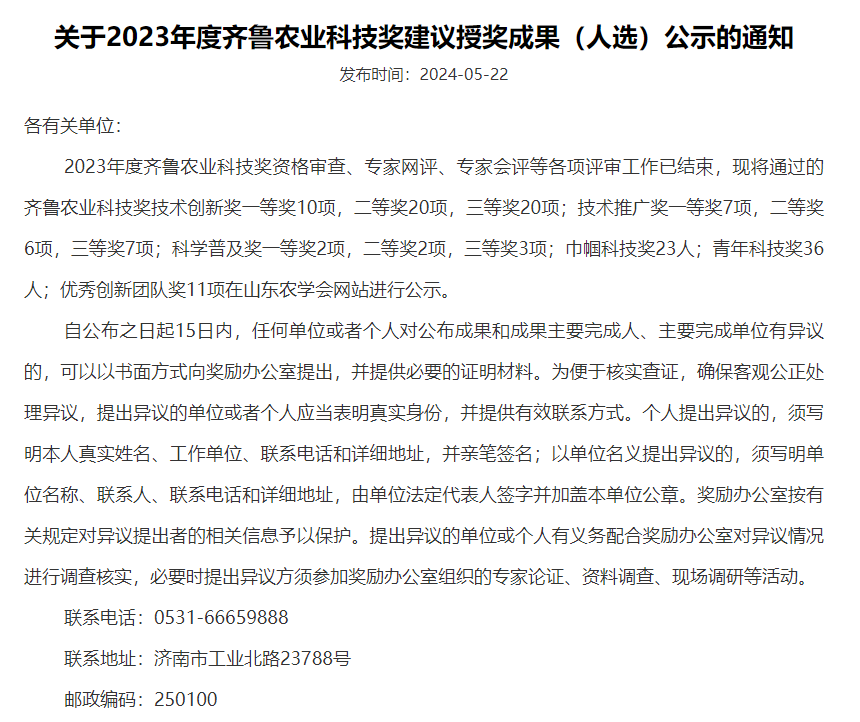 为进一步激励和调动广大农业科技人员的积极性,促进农业科技创新和技术进步,特经山东省科技厅备案批准,由山东农学会设立的“齐鲁农业科技奖”是面向全省农业行业的综合性科学技术奖。该奖每年评选1次,主要奖励为山东省农业科学技术进步和创新做出突出贡献的集体和个人,并促进农业科技创新,提升产业技术水平,助力我省乡村振兴中起到的积极推动作用。