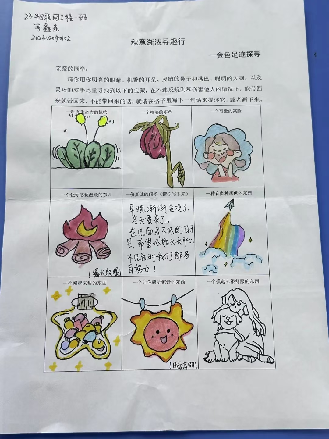 为了激发同学们的探索热情,丰富校园文化生活,10月20日,计算机学院展开了“秋意渐浓寻趣行”活动。这场别开生面的活动旨在让同学们在校园内寻找秋天的“宝藏”,通过观察、摸、嗅等方式感受秋天的变化,并将这些“秋天的藏”制作成标本。经过激烈的角逐和评委们的精心评选,一批优秀作品脱颖而出,现将这些作品进行展出。