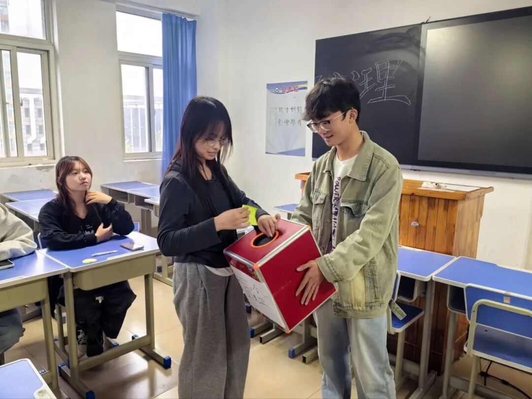 所有贴纸投入专属盲盒,经志愿者摇匀后,每位同学依次抽取 1-2 张。看到他人笔下自己的优点时,现场惊喜笑声与温暖交流声不断。活动还设置自愿发言环节,部分同学主动分享抽到的“优点贴纸”,讲述与同学的相处故事,进一步放大治愈效果。
