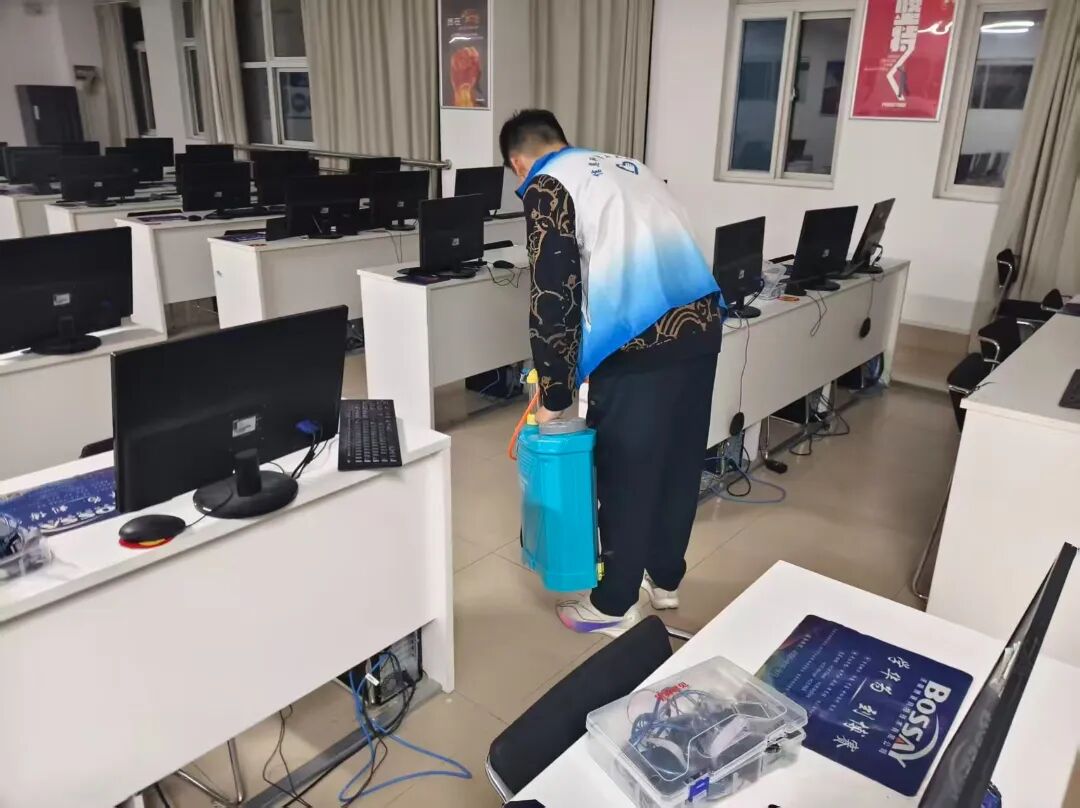 活动现场,大家手持扫帚、拖把、抹布等清洁工具,对教学楼公共区域、实验机房,教学楼附近停车区域及周边绿化带进行了全方位的清理。并同时对教室及走廊进行消毒喷洒。针对假期长时间无人使用的教室,志愿者们重点对黑板、讲台、门窗玻璃及墙角蜘蛛网进行了细致擦拭。不仅美化了环境,也消除了假期消防安全隐患。尽管天气寒冷,但大家干劲十足,在冬日的校园里汇成了一股暖流。