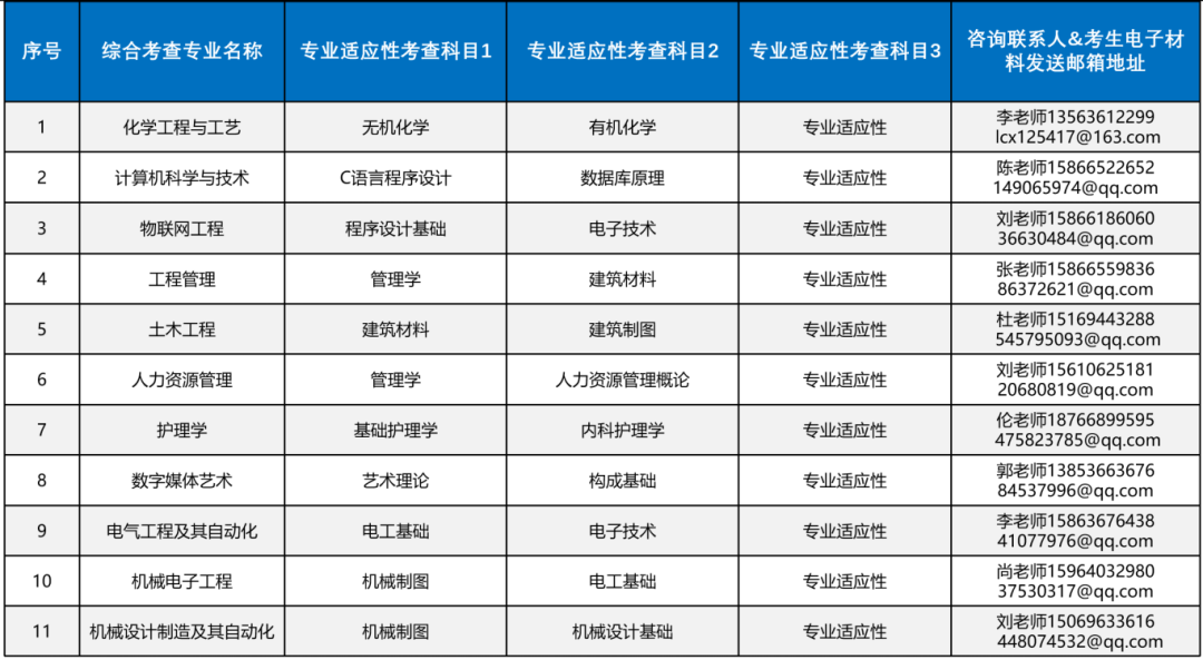 综合考查内容:考生材料综合评定(专科阶段学业成绩、专科期间获奖情况和服役期间立功受奖情况)和专业适应性考查(现场笔试形式)。