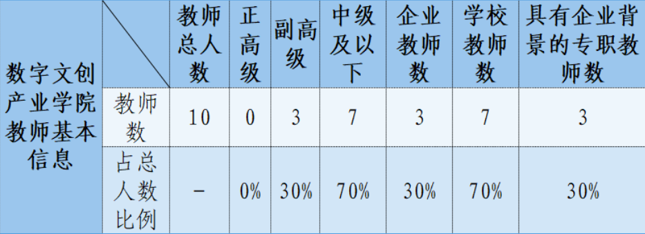 数字文创产业学院现有专职教师10名,其中副教授3人,具有硕士学位的8人,已建成院级创新团队1个。学院依托行业优势,聘请了一批德艺双馨的艺术家、业内专家、能工巧匠充实到兼职师资队伍中,发挥专家指导委员会作用,指导专业建设现已初步形成了一支具有较高水平的兼职教师队伍,构建了专兼结合的师资结构。共成立大师工作室和教师工作室共3个。立项市厅级以上课题 12 项,横向课题 10 项。